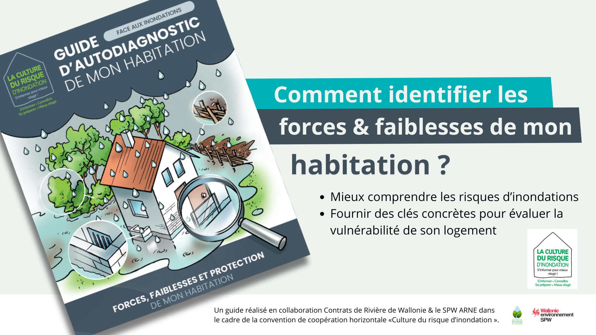 Dans la continuité de ces référentiels, les Contrats de rivière de Wallonie et le Service Public de Wallonie (SPW) proposent aujourd’hui un Guide d’autodiagnostic de l’habitation face aux inondations. Ce dernier complète la brochure « Réduire la vulnérabilité des constructions existantes » éditée par le SPW.